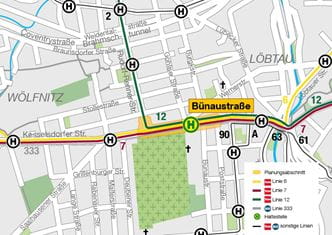 *Neben dem Standardfahrtweg für die Linien 6, 7 und 12 erfolgen über die Kesselsdorfer Straße Ein- und Ausrückefahrten zum/vom Betriebshof Gorbitz. Zudem ist der Streckenabschnitt eine wichtige Umleitungstrecke bei Baumaßnahmen/Havarien für die Linie 2.