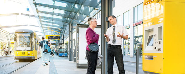 V našem zákaznickém centru na náměstí Postplatz, v našich servisních pobočkách na zastávkách Hauptbahnhof (Wiener Platz) a Prager Straße a také na recepci v naší správní budově v Trachenberger Straße 40 Vám rádi poradíme ve všem, co se týká našeho sortimentu jízdenek a všech našich nabídek a služeb.