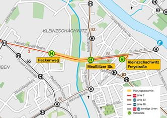 - Haltestellen: Heckenweg, Meußlitzer Straße, Kleinzschachwitz Freystraße