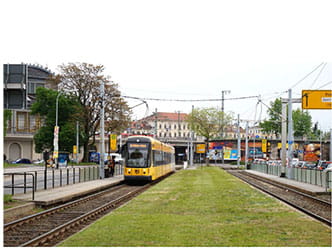 - Fahrbahnen und Gehwege sowie der angrenzende Platzbereich im Abschnitt zwischen Eisenbahnstraße und Großenhainer Straße verbleiben beim Haltestellenausbau im Bestand und werden erst später in einer zweiten Ausbaustufe durch die LH Dresden ausgebaut