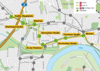 - Attraktivere Anbindung des Elbeparkes an die Wohngebiete entlang der Linie 13 (Pieschen, Leipziger Vorstadt, Neustadt)