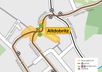 Im Rahmen der Umgestaltung des Dorfkerns Altdobritz wird die gleichnamige Haltestelle barrierefrei ausgebaut. Ziel der Maßnahme ist es, den historisch gewachsenen Dorfkern als öffentlichen Raum wieder nutzbar zu machen und harmonisch in das dörfliche Umfeld zu integrieren.