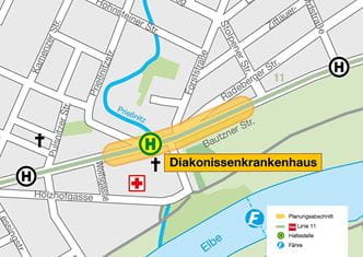 - Haltestellenlage: Verschiebung der Haltestelle zwischen die Einmündungen Diakonissenweg und Prießnitzstraße für kürzere Laufwege zum Diakonissenkrankenhaus und Gestaltung als sogenannte Kaphaltestelle mit angehobener Radfahrbahn