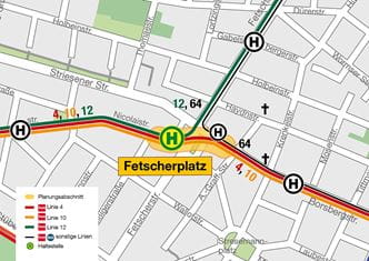 - Die vorhandenen Taxistellplätze werden vom Fetscherplatz in die Nicolaistraße verlegt. Dadurch kann die Platzfläche vergrößert und durch die Errichtung von Bordabsenkungen die barrierefreie Anbindung der Haltestelle in Richtung Süden verbessert werden.