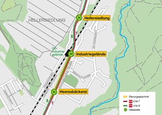 - Haltestellen: Heeresbäckerei, Industriegelände, Hellersiedlung