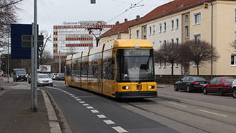- Trassierung: Ausbau der Gleistrasse (wie davor bereits vorhanden) mit mindestens 3-Meter-Achsabstand für die breiteren Stadtbahnwagen; Aufweitung der Gleise an der Kreuzung Meißner Straße/Zinzendorfstraße/August-Bebel-Straße, um zwischen den Gleisen eine extra Spur für Linksabbieger zu schaffen und so die Leistungsfähigkeit für alle Verkehrsteilnehmenden zu erhöhen