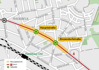 - Haltestellen: Hauptstraße, Zinzendorfstraße
