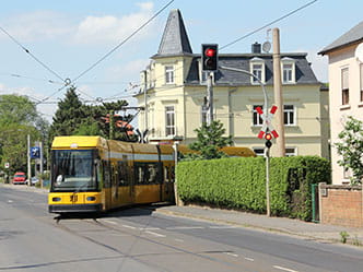 - Trassierung: Ausbau der Gleistrasse (wie jetzt bereits vorhanden) mit mindestens 3-Meter-Achsabstand für die breiteren Stadtbahnwagen; Aufweitung der Gleise an der Kreuzung Meißner Straße/Moritzburger Straße/Bahnhofstraße, um zwischen den Gleisen eine extra Spur für Linksabbieger zu schaffen und so die Leistungsfähigkeit für alle Verkehrsteilnehmenden zu erhöhen
