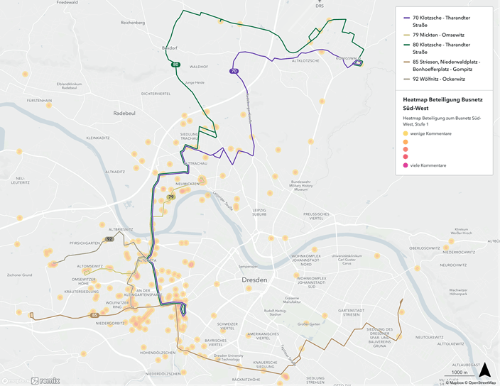 Auf der abgebildeten Karte verdeutlichen die eingefärbten Flächen die Bereiche, in denen viele Kommentare gesetzt wurden, es also eine rege Diskussion gab. Schwerpunkte waren insbesondere die Verbindung von Gompitz und Gorbitz bzw. Omsewitz über Altcotta zum Elbepark, der Busverkehr auf der Reisewitzer Straße und die räumliche Situation in Altcotta.
