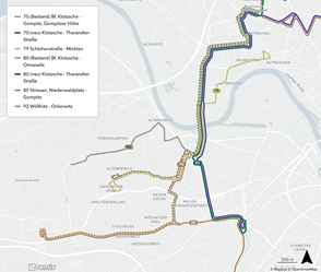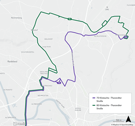 - Die Verlängerung der Linien 70/80 kann Umstiege reduzieren, dies ist allerdings mit zusätzlichem Aufwand verbunden. Beide Linien müssten jeweils einen zusätzlichen Bus einsetzen, um den 20-Minuten-Takt zu gewährleisten.