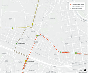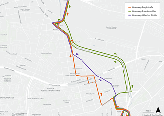 - Der Vorschlag einer Führung der Linie jeweils im Einrichtungsverkehr über Pietzschstraße und Oskar-Meine-Straße setzt ebenfalls bauliche Maßnahmen und Eingriffe in den Parkraum voraus.