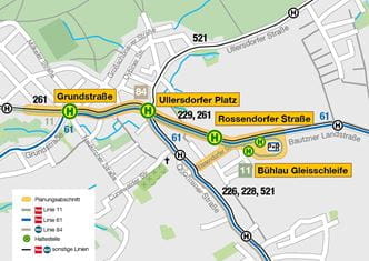 Als Lösungsweg wird eine Verlängerung der Straßenbahnlinie 11 bis an den östlichen Rand Bühlaus verfolgt. Damit wandert die Gleisschleife vom Ullersdorfer Platz an die Rossendorfer Straße. Bei Bedarf ließe sich von hier die „11“ später auch nach Weißig verlängern. Der Busendpunkt verbleibt weiterhin am Ullersdorfer Platz.