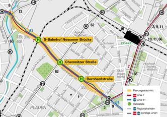 Die Nossener Brücke besteht aus vier aufeinanderfolgenden Brücken über die Fabrikstraße, das Heizkraftwerksgelände der SachsenEnergie AG, die Bahnanlagen der DB AG und die Zwickauer Straße. Sie ist seit 1964 für den Verkehr freigegeben. Alle Brücken befinden sich nunmehr in einem schlechten Zustand. Deshalb sind ihr Abriss und der Ersatz durch einen neuen dreiteiligen Brückenzug mit einer separaten Straßenbahnbrücke in Mittellage vorgesehen. Die Brücken erhalten jeweils zwei Fahrstreifen pro Richtung und beidseitig einen 2,50 Meter breiten Radweg. Auf der Brücke entsteht eine neue Haltestelle. Der Zu- und Abgang unserer Fahrgäste wird über einen Fußweg mit Treppen und barrierefreien Rampen zur Fabrikstraße sowie zur Zwickauer Straße möglich sein.