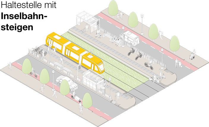 | Querungsmöglichkeiten | Stellen, an denen Zufußgehende die Straße oder den Gleisbereich queren können. Sie können gesichert (z. B. mit einer Ampel) oder ungesichert in Form einer Verkehrsinsel sein. | |