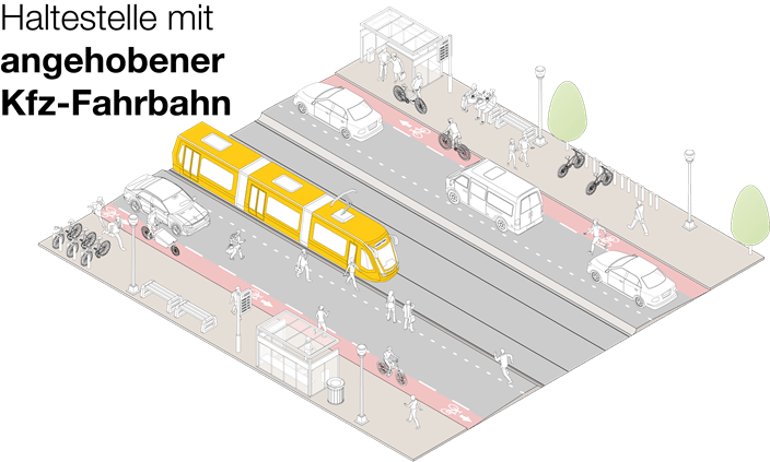 Haltestelle mit angehobener Kfz-Fahrbahn