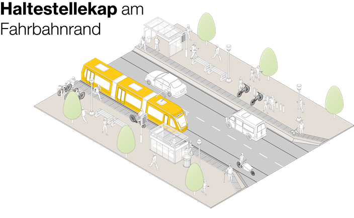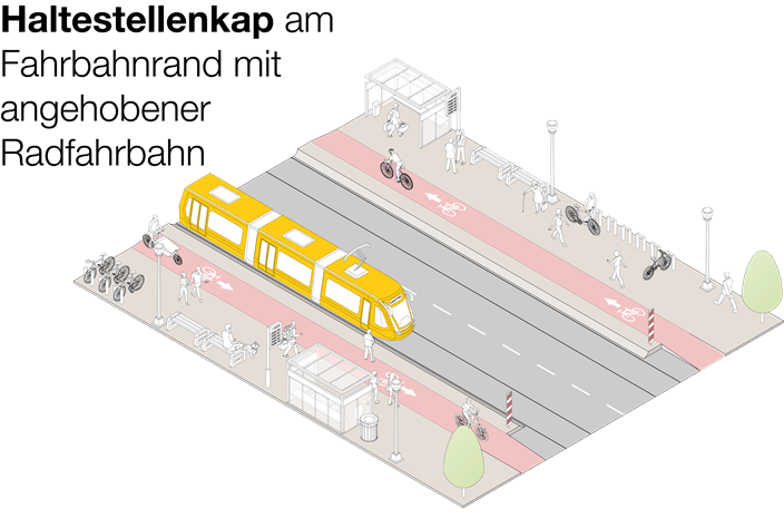 Haltestellenkap am Fahrbahnrand mit angehobener Radfahrbahn