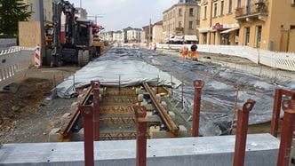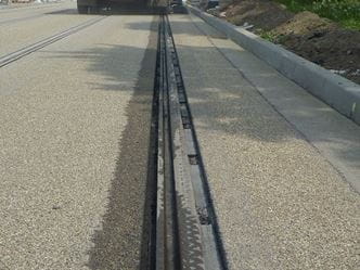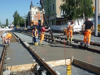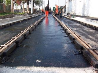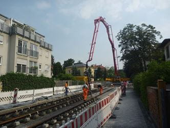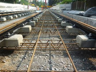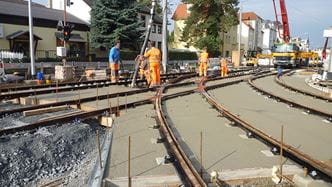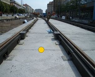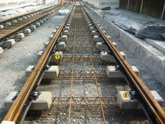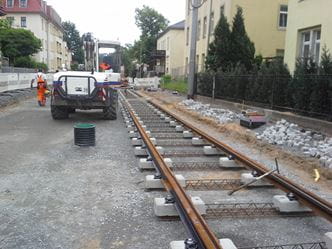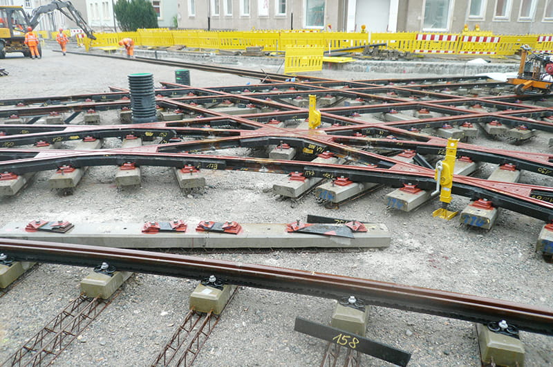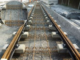Die bei der Fernbahn bereits vielfach angewendete Feste-Fahrbahn-Technik mit einbetonierten Zweiblockschwellen wurde für den Einsatz im Straßenbahngleisbau modifiziert und an die Lastannahmen des Schienen- und Straßenverkehrs angepasst.
