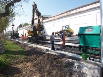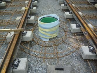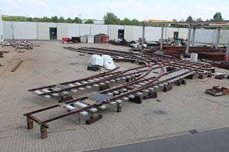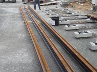 Die Rillenschienen werden mit einem Korossionschutzanstrich versehen und auf den vormontierten Zweiblockschwellen ausgelegt und befestigt.