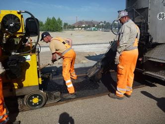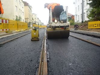 Verdichten des Asphaltmischgutes mittels Walzen und Vibrationsstampfer.