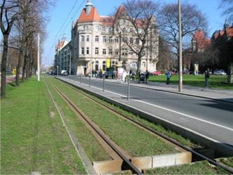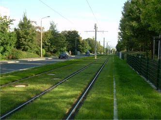 In Dresden wird seit 1995 der Anteil Rasengleis im Gleisnetz kontinuierlich gesteigert.