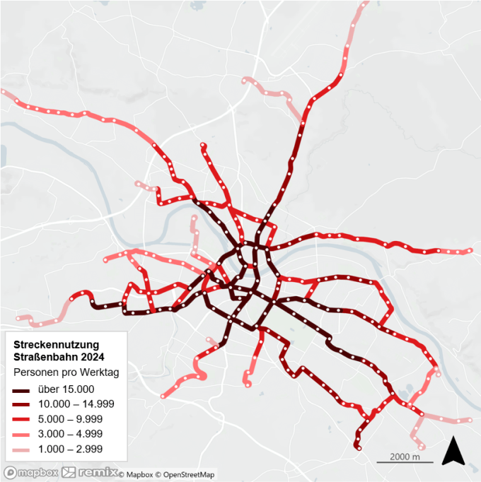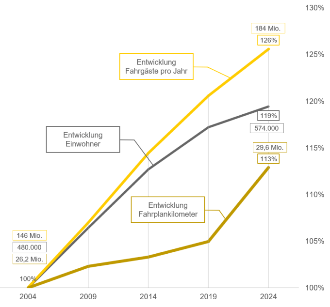Die Anzahl der Fahrgäste ist in den letzten 20 Jahren deutlich stärker gestiegen als die Einwohnerzahl Dresdens. Das ist u. a. auf die zahlreichen Liniennetzanpassungen zurückzuführen, die den Bedürfnissen unserer Kundschaft entsprechen. An den Wochenenden wuchs die Nachfrage deutlich stärker als an Werktagen, weil der ÖPNV zunehmend in der Freizeit genutzt wird.