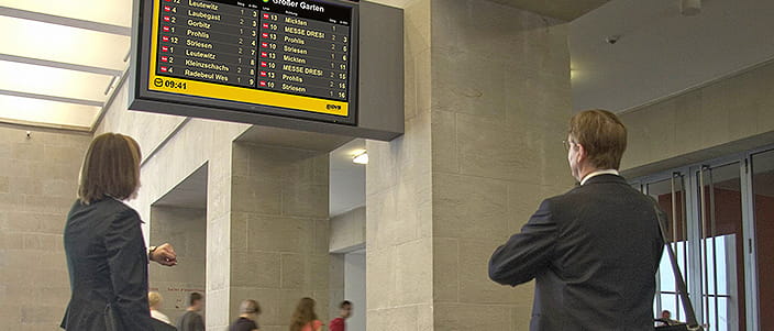 Mit einer Webanwendung, die wir Ihnen kostenlos zur Verfügung stellen, werden unsere Abfahrtszeiten für jede beliebige Haltestelle minutengenau auf großen Monitoren, Bildwänden oder Ihrem Digital-Signage-System angezeigt. Neben den Echtzeitdaten unserer Fahrzeuge sind auch die fahrplanmäßigen Abfahrtszeiten aller Regionalbusse, S-Bahnen, Fern- und Regionalzüge sichtbar. Solch eine bildschirmfüllende Darstellung eignet sich besonders für Restaurants, Einkaufszentren und Behörden oder auch für einzelne Geschäfte sowie Büroräume.