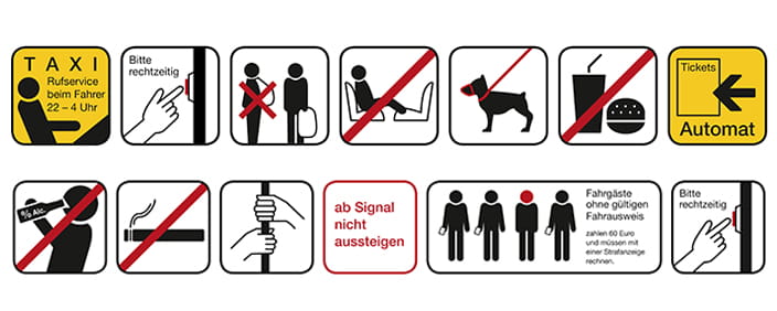 Leicht verständlich und gut erkennbar: Unsere Piktogramme in Bahn und Bus. Sie verweisen auf die Einhaltung wichtiger Grundregeln in unseren Fahrzeugen, die Teil unserer Beförderungsbedingungen sind.