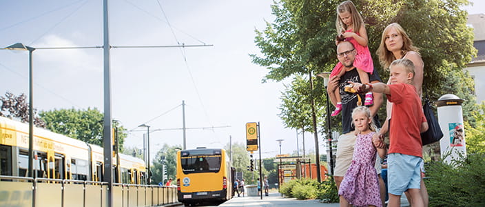 Für einen schönen Ausflug mit der Familie: Eine Familientageskarte können maximal zwei Erwachsene und max. vier Schülern bis zum 15. Geburtstag nutzen. Mit dem Ticket können auch sechs Schüler ohne Begleitung Erwachsener fahren. Die Familientageskarte gilt für alle öffentlichen Verkehrsmittel (außer Sonderverkehrsmittel) ab Entwertung bis 4 Uhr morgens des Folgetages. Das Ticket gibt es für eine Tarifzone, mehrere Tarifzonen oder den gesamten Verkehrsverbund Oberelbe.