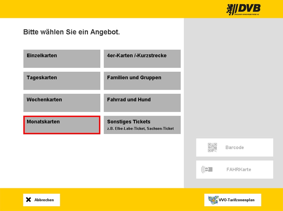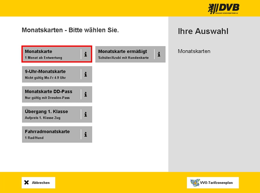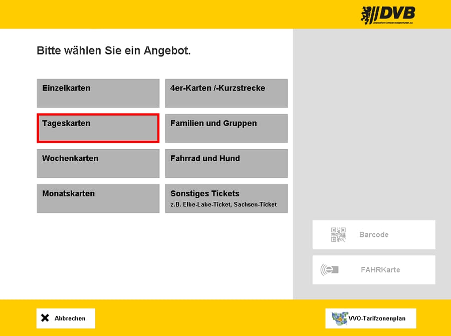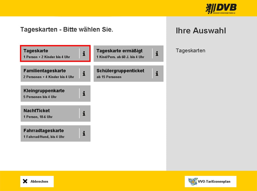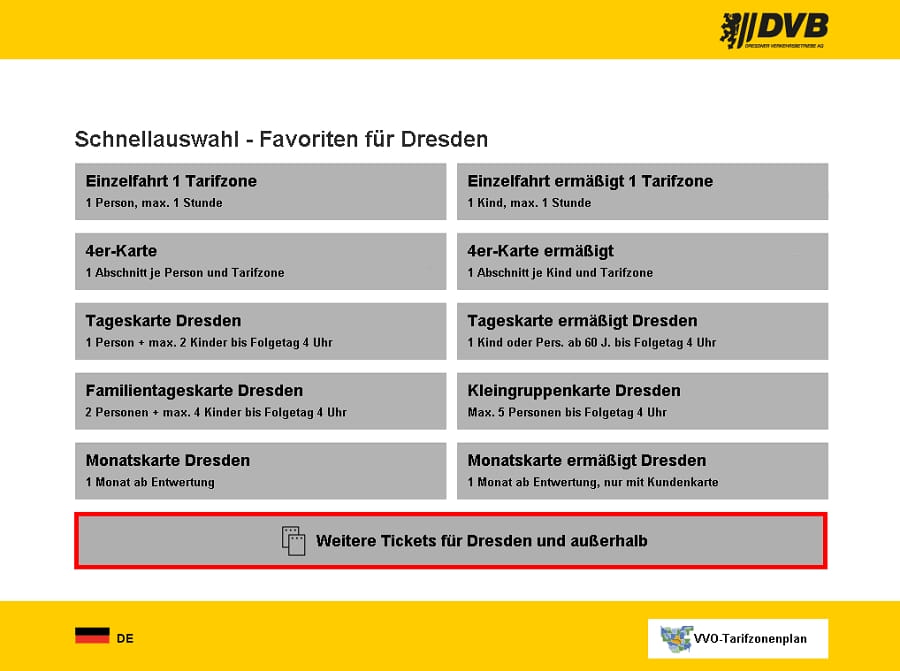 Ihnen stehen alle Tickets des VVO-Tarifs zur Verfügung.