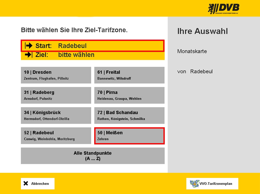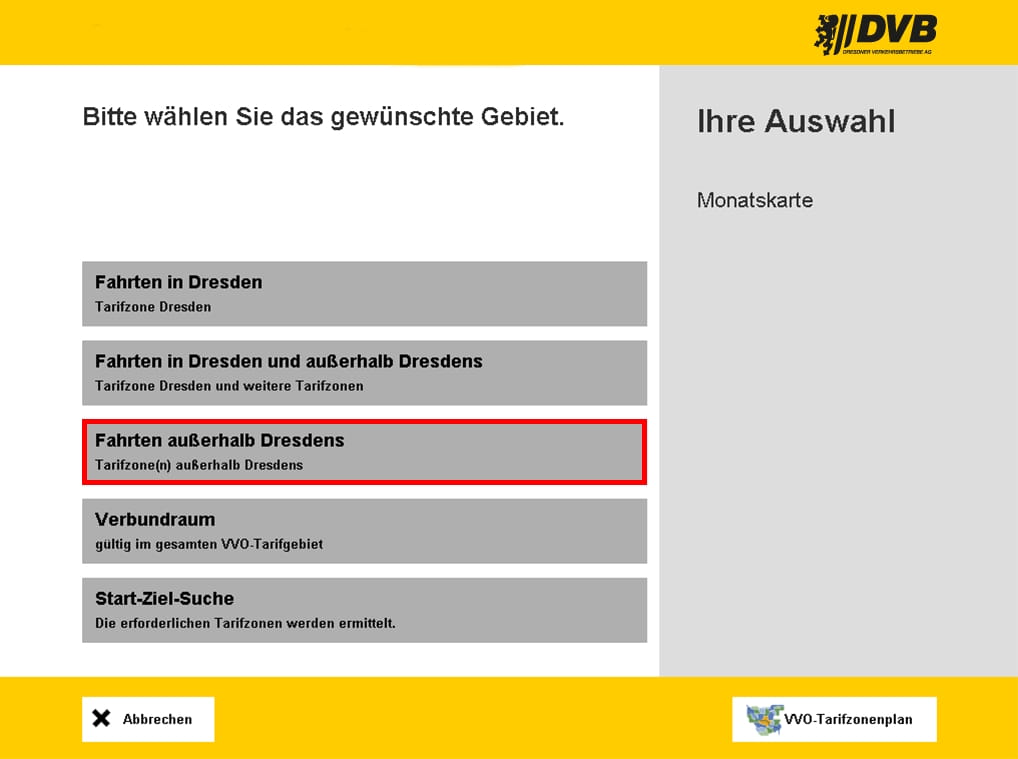 Nutzen Sie im Startmenü „Weitere Tickets für Dresden und außerhalb“ und wählen Sie zunächst die Art des benötigten Tickets, z. B. Tageskarte. Vorausgesetzt, Sie haben bereits eine Fahrkarte für Dresden, geben Sie in der Option „Fahrten außerhalb Dresdens“ nacheinander ein, ab welcher Tarifzone außerhalb Dresdens Sie die Fahrkarte benötigen und in welcher Tarifzone Ihr Ziel liegt. Die Anzahl der benötigten Tarifzonen bzw. die Preisstufe ermittelt der Automat.