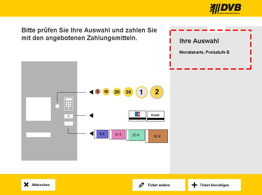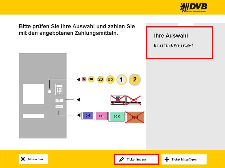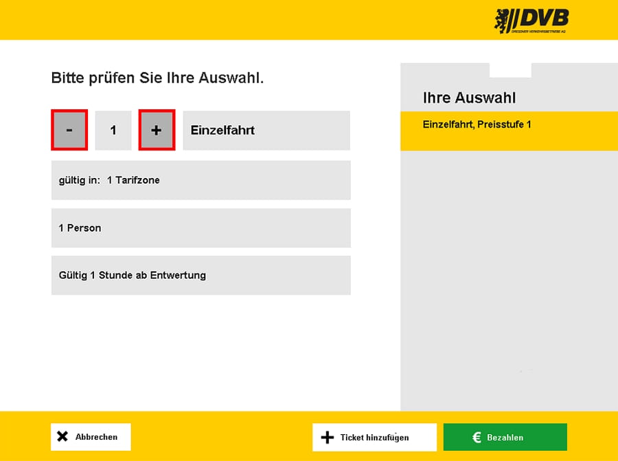Wenn es im Haltestellenbereich keinen weiteren Fahrkartenautomaten oder einen DVB-Servicepunkt gibt, können Sie im Fahrzeug eine Fahrkarte kaufen. Unsere Bahnen und Busse gibt es mobile Automaten, die Ihnen zwar nicht alle, aber die wichtigsten Fahrscheine (Einzelfahrt zum Normalpreis, ermäßigte Einzelfahrt, Tageskarte zum Normalpreis und Familientageskarte) verkaufen. Die Bezahlung erfolgt ausschließlich bargeldlos, indem Sie Ihre Geldkarte oder das Smartphone an das Lesegerät halten.