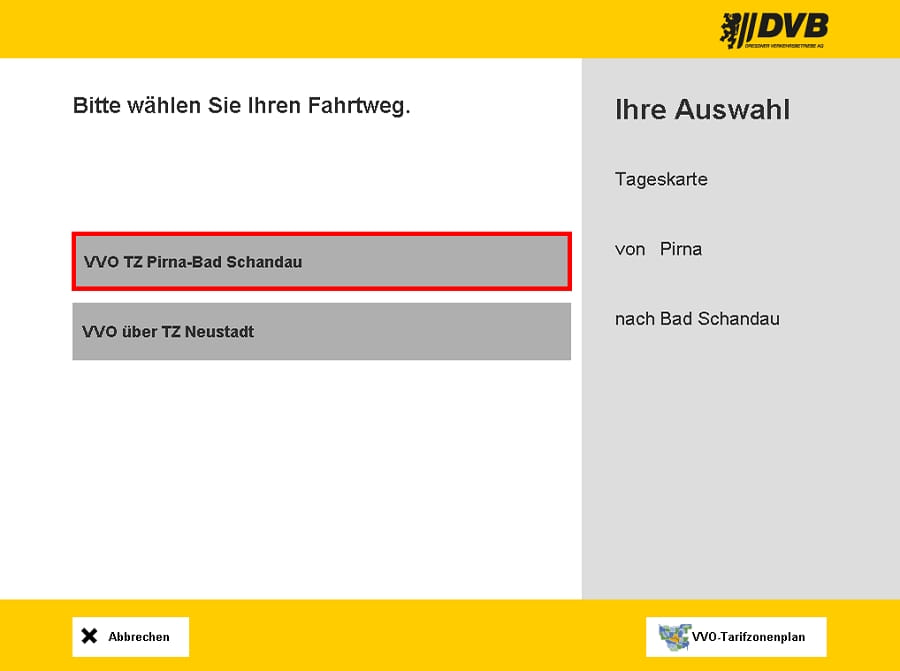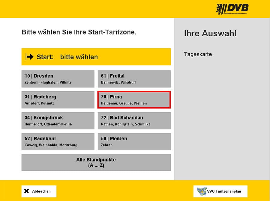Schritt für Schritt am Beispiel der Tageskarte außerhalb Dresdens für eine Fahrt von Pirna bis Königstein: