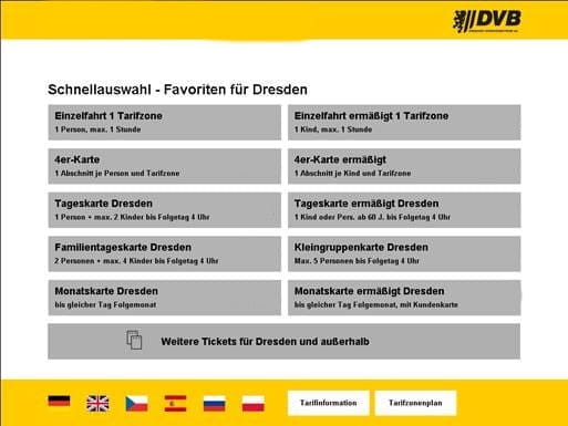 Neben den angebotenen Tickets wie Einzelfahrt, 4er-Karte, Tages-, Wochen- und Monatskarte in allen Preisstufen, können Sie auch die Tickets für z. B. den Elbe-Labe-Raum (Böhmen), den Übergang in die 1. Klasse der S-Bahn sowie Schülergruppentickets erwerben. Zum Kauf stehen zudem Tickets für Dresden-Pass-Inhaber und das Sachsen-Ticket der DB Regio für verbundüberschreitende Fahrten zur Auswahl.