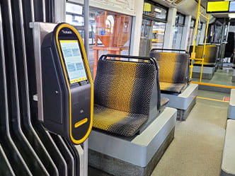 W każdym tramwaju znajduje się automat, w którym kupić można wprawdzie nie wszystkie, ale najważniejsze bilety (jednorazowe, całodzienne). W tramwajach automaty umieszczone są w przedniej części wagonu między pierwszymi i drugimi drzwiami. Płatności w tramwajach są wyłącznie zbliżeniowe i bezgotówkowe - wystarczy przyłożyć kartę płatniczą lub smartfon do czytnika.